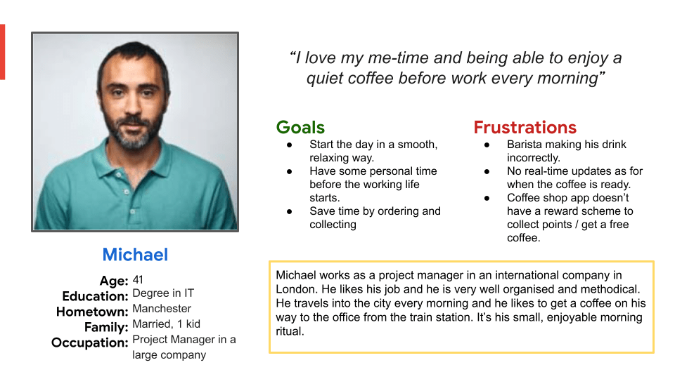 Michael is someone who travels into the city for work. He needs to order his coffee in advance because he doesn’t have the time to queue every morning before work.