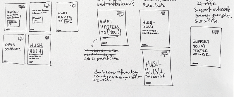 I decided to focus on the fact that the information we are asking from the public can be anonymous as people are more keen to provide information when they feel safe. I proceeded with the ‘Hush-Hush’ message as it gives a sense of secrecy and confidentiality.